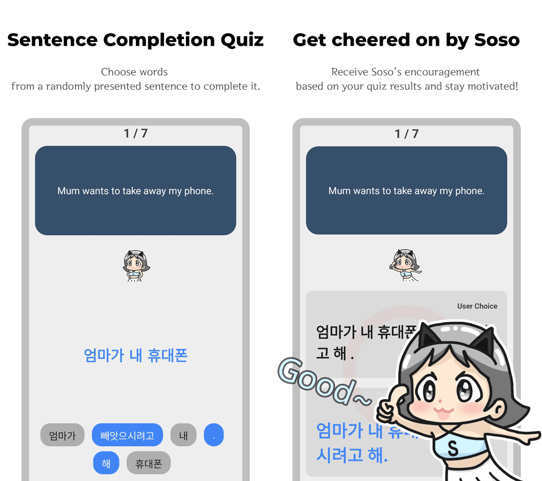 Get motivated and enjoy memorizing sentences with soso's cheerful support!